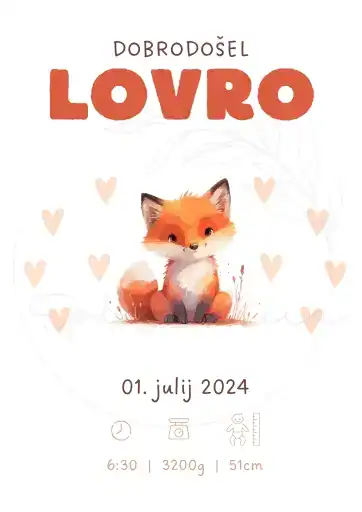 Personalizirana ilustracija Lisička z nežnim motivom in podatki o rojstvu otroka je čudovit spomin na začetek novega življenja.