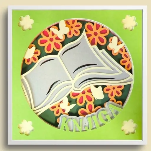 - 3D slika z motivom odprte knjige simbolizira znanje, domišljijo in ljubezen do branja.